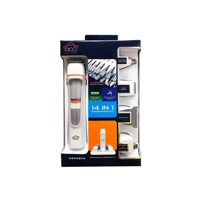 Grooming kit impermeabile 14 in 1 con rifinitore a doppia lama angolata, alimentato da batteria al litio da 500 mAh. Include testine intercambiabili per barba, capelli, naso e micro rasatura, con guida taglio regolabile e base con spina magnetica. Pratico, potente e ricaricabile in 2 ore, offre fino a un’ora di autonomia.