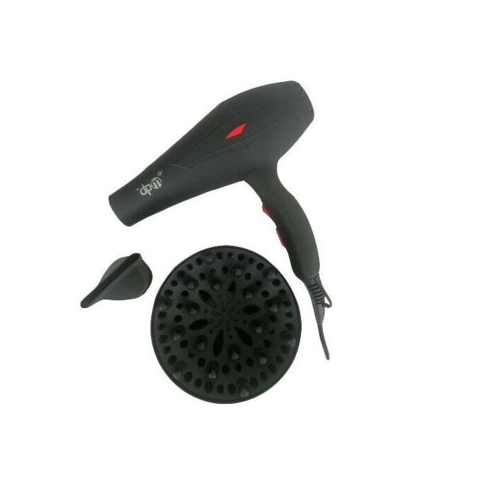 Asciugacapelli professionale da 2200 W con motore AC, 2 temperature selezionabili, tasto aria fredda e doppia velocità. Include diffusore e concentratore, filtro removibile e cavo con gancio da 2 m.