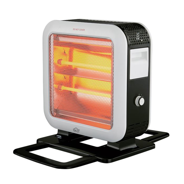 Stufa al quarzo con 4 elementi riscaldanti, regolabile su 4 livelli di potenza fino a 1200W. Struttura in metallo con irradiamento su tre lati e maniglia per un facile trasporto. Ideale per un riscaldamento efficiente e rapido.